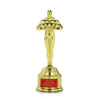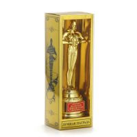 Золотистая фигура «Оскар» с лавровым венком в руках дополнена пластиковой подставкой. На постаменте есть яркий голографический шильд со званием получателя награды.