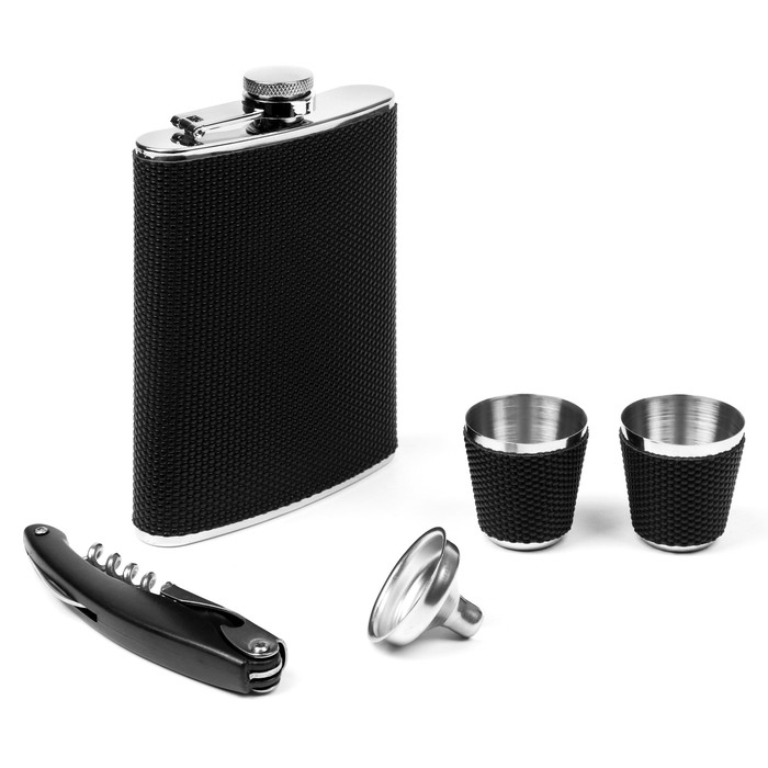 Подарочный набор 5 в 1, фляжка 240 мл, воронка, штопор, 2 рюмки, нержавеющая сталь, пластик, чёрный