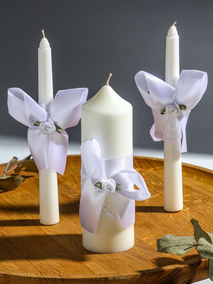- Символичность традиции: набор специально создан для трогательного обряда семейного очага, где большая свеча символизирует новый союз, а две другие — родительские дома.